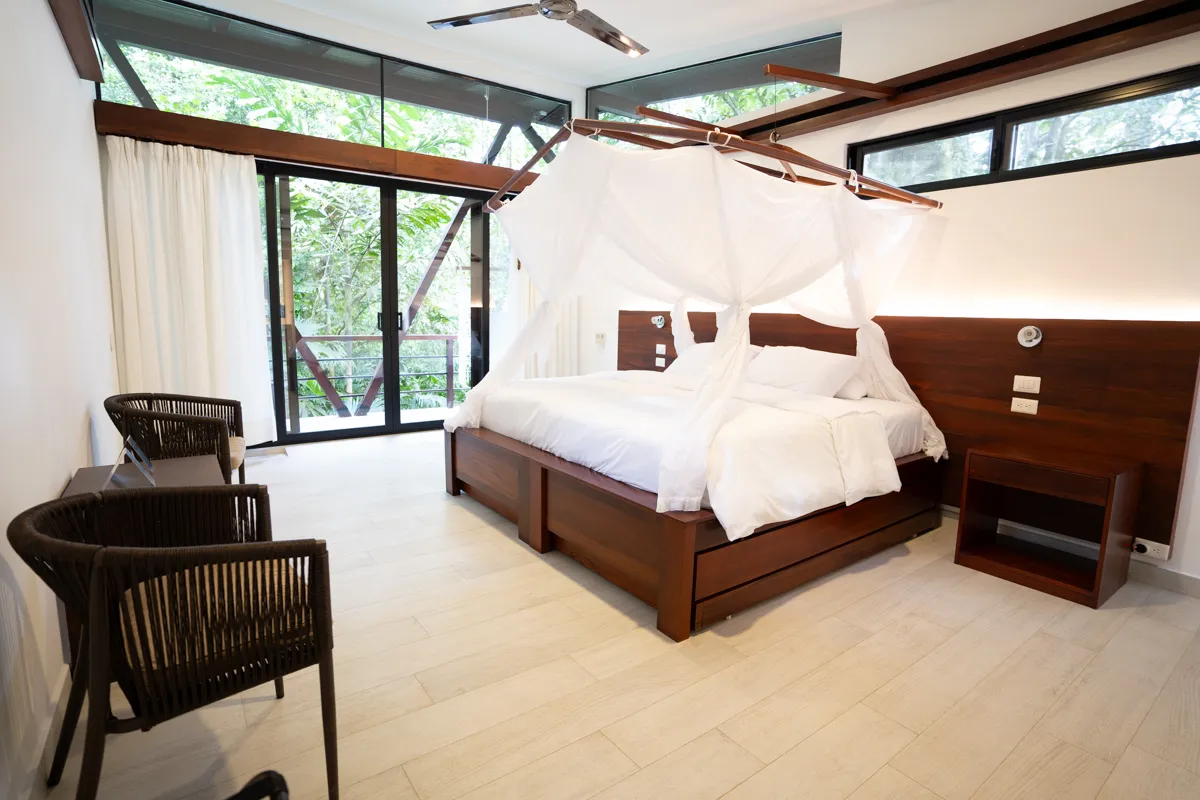 Each room features whitewashed Nordic ceramic flooring and canopy beds hand-built from Amazonian wood dressed in crisp, white cotton linens. A split bathroom features a double sink vanity and oversized mirror wall, with a separate en-suite bathroom complete with a rainfall showerhead for a spa-like experience.
